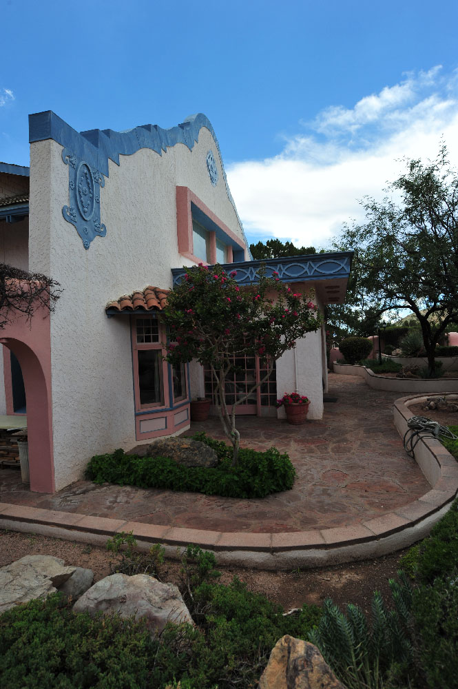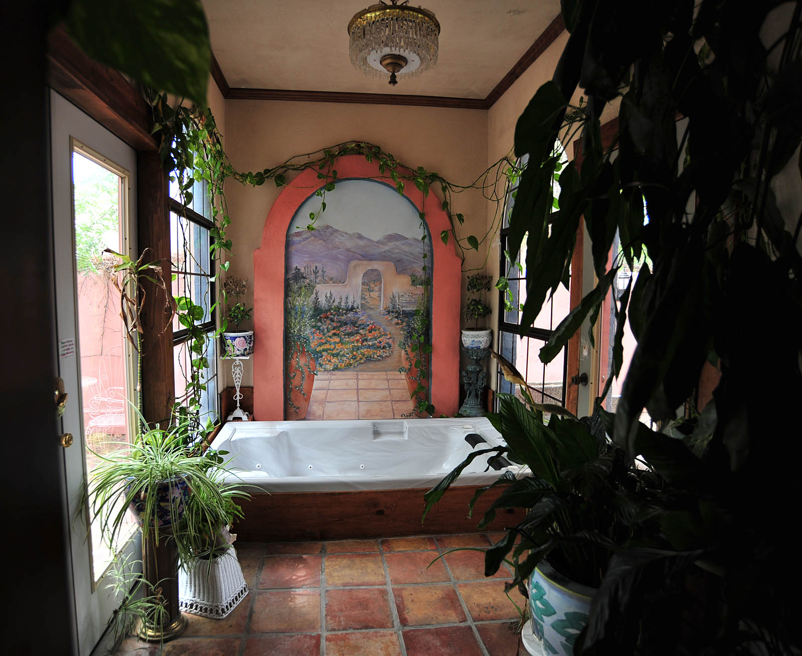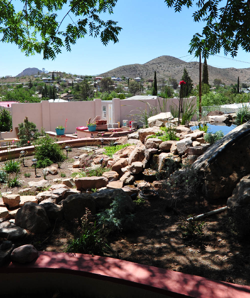After passing through a few owners and experiencing many alterations, the Curry home became the residence of John and Joy Timbers in 1977. Since that year the Timbers have conducted a careful restoration and enhancement of the home and its grounds. Its development has stretched from years to decades. The garden which was originally merely a frame for the house became a captivating project in its own right. Terracing, massive walls and rocks, impart a bold three-dimensional texture to the grounds and compliment the massive lines of the structures. Mostly lush desert flora has been selected, to which our particular Southwest zone is friendly, as well as suiting the home’s Mission revival theme. And, just as it was when Henry Trost designed the structure, Warren is still a tranquil environment only minutes from the noise and bustle of downtown Bisbee.