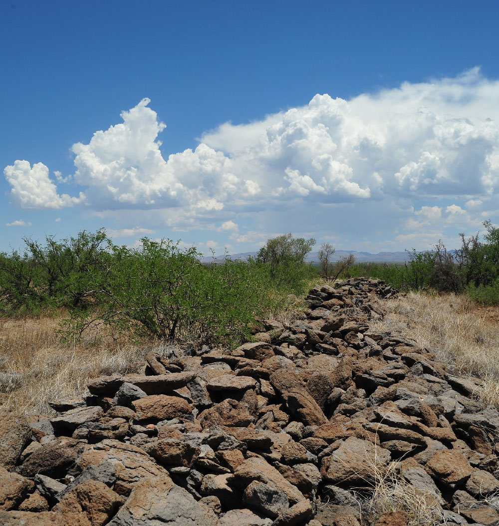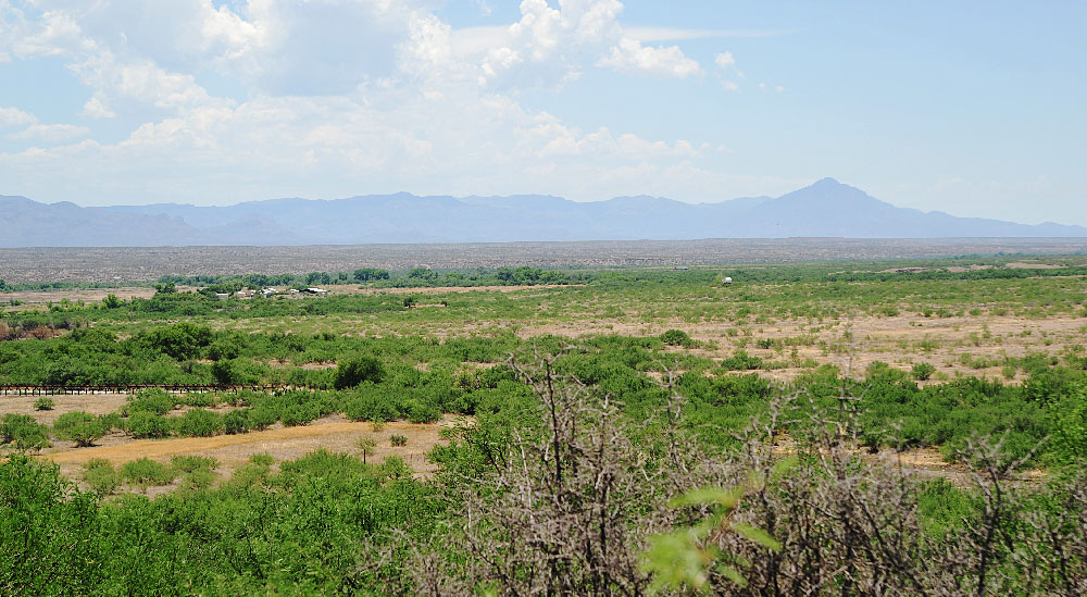 East of the ranch house and past the pond are the remains of what is often referred to as either Camp San Bernardino Ranch or The Slaughter Ranch Outpost, a US Army facility established in 1911 in reaction to unrest along the US/Mexico border. Soldiers from the facility, many of them African-Americans assigned to the famous 9th Infantry Buffalo Soldier unit, took part in the 1916 punitive expedition into Mexico commanded by General Jack Pershing in a vain attempt to capture or kill Francisco "Pancho" Villa for attacking Columbus, New Mexico. Stories abound of John Slaughter's visits to the camp; the old man was said to truly enjoy playing cards with the soldiers and loved their company. The isolated facility was decommissioned in 1923. Only stones that lined pathways and a few foundations of some buildings still attest to the camp's existence but the site still provides a stunning view into Mexico. (Photo to left is taken from the camp's south perimeter. There's a metal fence marking the US/Mexico border visible across the lower center portion of the image.)