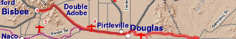 Located 15 miles east of Douglas (Click map to your left for a printable enlargement), you're less than an hour from Bisbee when you park beside the Slaughter Ranch corral. The last 14 miles from Douglas to the ranch is on a well-maintained dirt road (Geronimo Trail) but be aware that rainy weather can create some slippery conditions. Slaughter's San Bernardino Ranch is a Registered National Historic Landmark. It's maintained entirely with private funds, no public money is involved. Visitor fee is $8 per person (under 14 years old free). San Bernardino Ranch (Slaughter Ranch) is open to visitors Wednesday through Sunday from 9:30 AM until 3:30 PM. Call 520-678-7935 for more info--or to verify the hours before making the drive out to the ranch.